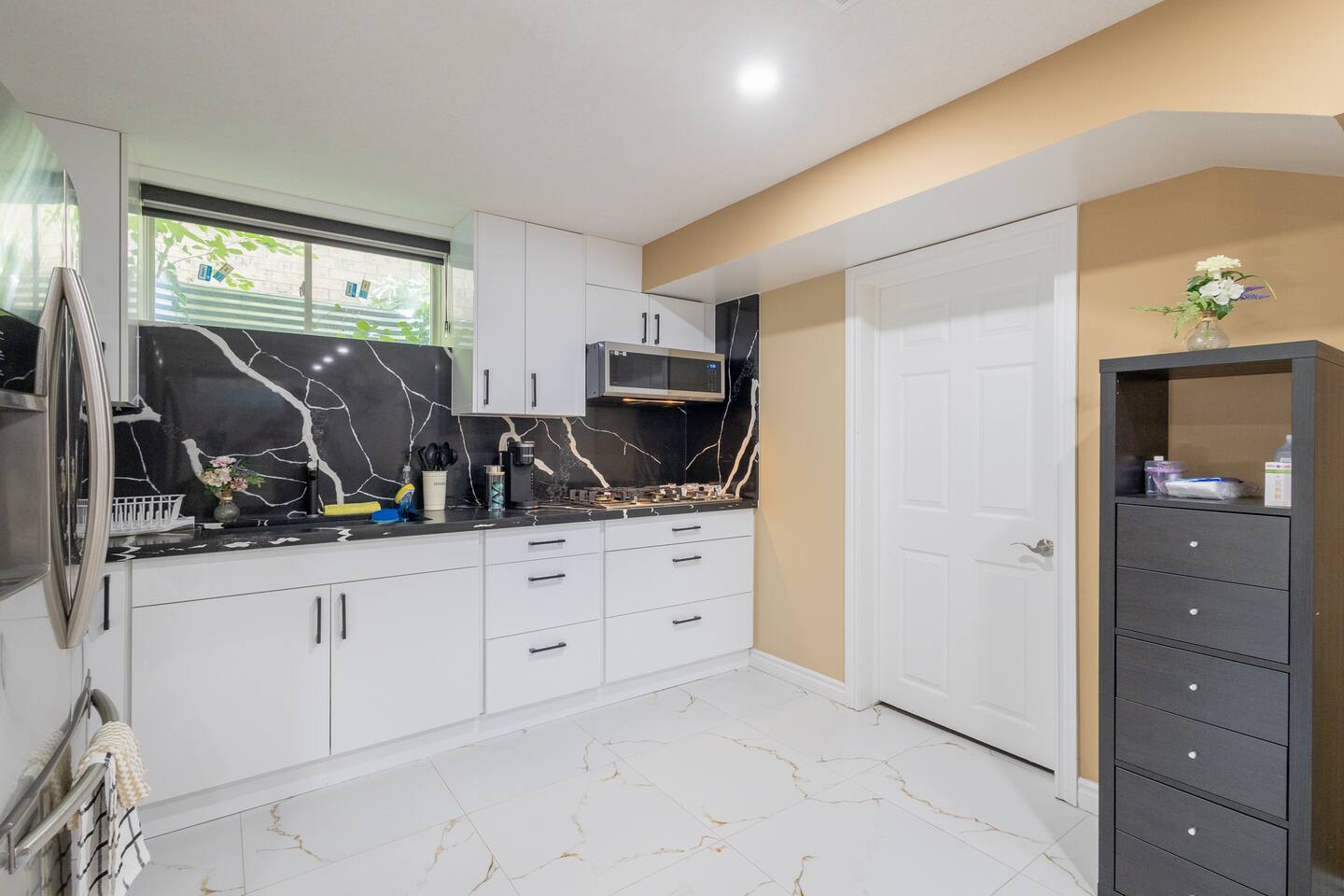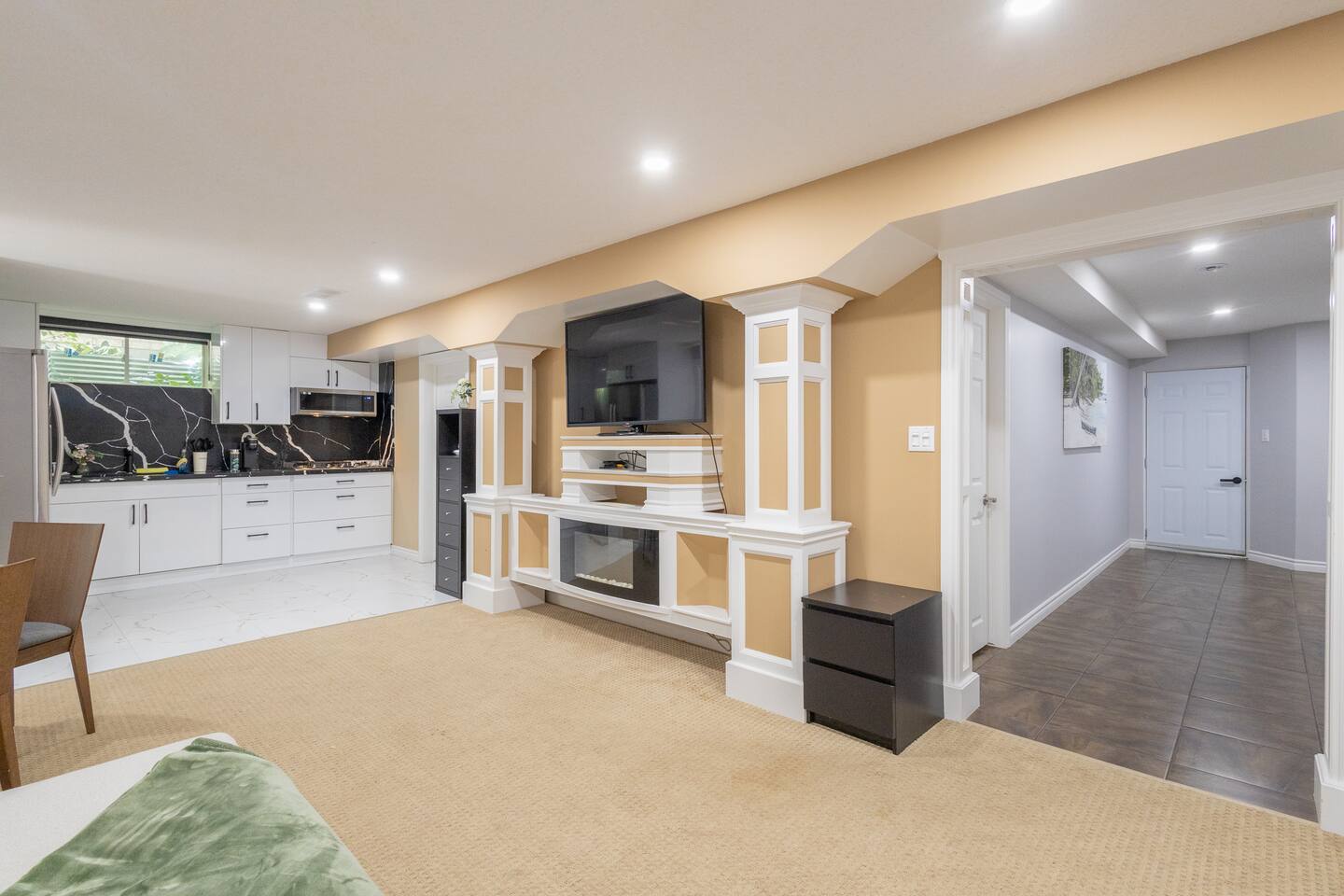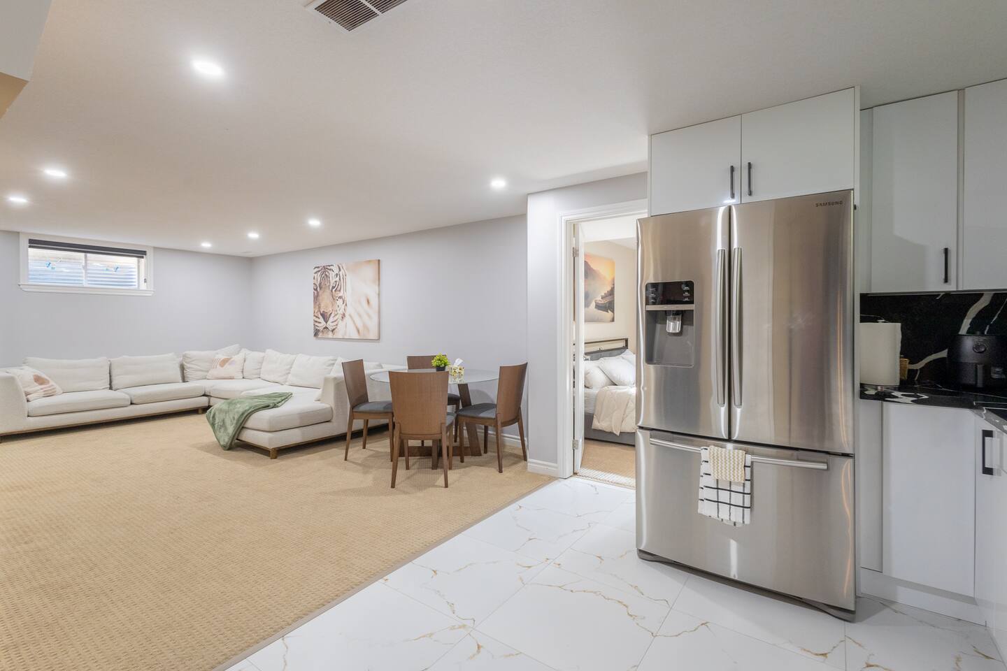 Modern 1-bedroom, 1-bathroom walkout unit featuring a luxury full sized kitchen with laundry, and outdoor patio for ultimate relaxation. The spacious living area features a 55-inch TV and separate entrance. The kitchen’s layout adds elegance, while the cozy bedroom promises restful nights. Stay connected with high-speed Wi-Fi. Perfect for a single occupant or couple looking for comfort and privacy